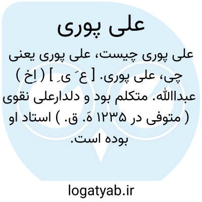 علی پوری. [ ع َ ی ِ ] ( اِخ ) عبداﷲ. متکلم بود و دلدارعلی نقوی ( متوفی در 1235 هَ. ق. ) استاد او بوده است. او راست: 1 - تنزیه الصفی، در کلام. 2 - حمایةالایمان، در کلام. 3 - الفصلین فی امانة امیرالثقلین. 4 - فصوص المؤمنین. ( از معجم المؤلفین بنقل از اعلام الشیعه آقابزرگ ج 2 ص 155 ).