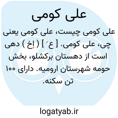 علی کومی. [ ع َ ] ( اِخ ) دهی است از دهستان برکشلو، بخش حومه شهرستان ارومیه. دارای 100 تن سکنه. آب آن ازنهر شهرچای تأمین میشود. و محصول آن غلات، توتون، چغندر و حبوب است. ( از فرهنگ جغرافیایی ایران ج 4 ).