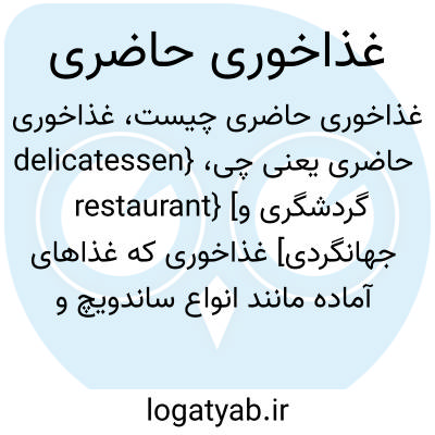 {delicatessen restaurant} [گردشگری و جهانگردی] غذاخوری که غذاهای آماده مانند انواع ساندویچ و رست بیف و سالاد سیب زمینی عرضه می کند متـ. رستوران حاضری