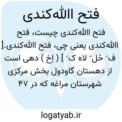 فتح اﷲکندی.[ ف َ حُل ْ لاه ک َ ] ( اِخ ) دهی است از دهستان گاودول بخش مرکزی شهرستان مراغه که در 47 هزارگزی جنوب مراغه و شش هزارگزی خاور شوسه مراغه به میاندوآب قرار دارد. جلگه ای و معتدل و دارای 46 تن سکنه است. آب آنجااز رودخانه لیلدن و محصول عمده اش غلات، چغندر، نخودو شغل اهالی زراعت و صنایع دستی آنها جاجیم بافی است. راه مالرو دارد. ( از فرهنگ جغرافیایی ایران ج 4 ).