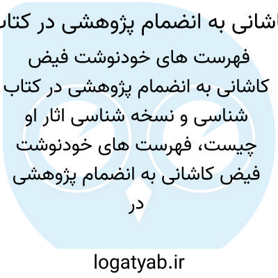 [ویکی نور] فهرست های خودنوشت فیض کاشانی به انضمام پژوهشی در کتاب شناسی و نسخه شناسی آثار او. فهرست های خودنوشت فیض کاشانی همان "کتاب شناسی فیض کاشانی" است که به کوشش محسن ناجی نصرآبادی از دانشمندان معاصر ایران، تصحیح و تحقیق شده است. وی در مبحث کتاب شناسی آثار فیض، سعی وافر کرده که همه فهرست های نسخه های خطی موجود کتابخانه های ایران و برخی کشورهای دیگر را در حوزه تحقیق خود جای دهد.