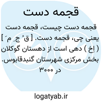 قجمه دست. [ ق ُ ج ِ م َ ] ( اِخ ) دهی است از دهستان گوکلان بخش مرکزی شهرستان گنبدقابوس. در 3000 گزی شمال خاوری کلاله واقع و موقع آن دامنه و معتدل مالاریائی است. 350 تن سکنه دارد. آب آن از رودخانه ٔتکیه قوز و محصولات آنجا برنج و غلات و حبوبات و صیفی و لبنیات و شغل اهالی زراعت و گله داری و صنایع دستی زنان مختصر بافتن پارچه های ابریشمی است. از کلاله اتومبیل می توان برد. ( از فرهنگ جغرافیایی ایران ج 3 ).