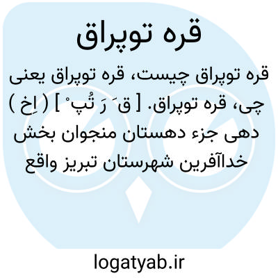 قره توپراق. [ ق َ رَ تُپ ْ ] ( اِخ ) دهی جزء دهستان منجوان بخش خداآفرین شهرستان تبریز واقع در 27 هزارگزی جنوب خداآفرین و 22 هزارگزی شوسه اهر به کلیبر. موقع جغرافیایی آن کوهستانی و گرمسیر مالاریائی است. سکنه آن 69 تن. آب آن از چشمه و محصول آن غلات. شغل اهالی زراعت و گله داری است. راه مالرو دارد. ( از فرهنگ جغرافیایی ایران ج 4 ).