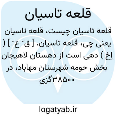 قلعه تاسیان. [ ق َ ع َ ] ( اِخ ) دهی است از دهستان لاهیجان بخش حومه شهرستان مهاباد، در 38500گزی باختر مهاباد و 16500گزی خاور شوسه خانه بنقده قرار گرفته و موقع جغرافیایی آن کوهستانی و هوای آن معتدل، مالاریایی و دارای 407 تن سکنه است. آب آن از رودخانه آواجیر و محصول آن غلات، توتون، حبوب و شغل اهالی زراعت و گله داری است و صنایع دستی زنان جاجیم بافی است. راه مالرو دارد. ( از فرهنگ جغرافیایی ایران ج 4 ).