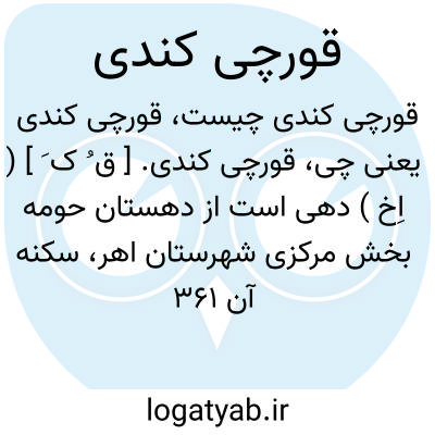 قورچی کندی. [ ق ُ ک َ ] ( اِخ ) دهی است از دهستان حومه بخش مرکزی شهرستان اهر، سکنه آن 361 تن. آب آن از چشمه. محصول آن غلات و حبوب و شغل اهالی زراعت و گله داری و صنایع دستی زنان آنجا فرش و گلیم بافی است.راه مالرو دارد. ( از فرهنگ جغرافیایی ایران ج 4 ).