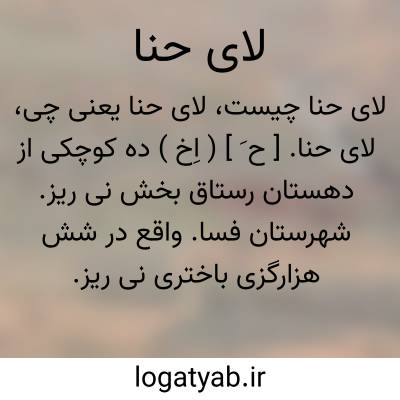 لای حنا. [ ح َ ] ( اِخ ) ده کوچکی از دهستان رستاق بخش نی ریز. شهرستان فسا. واقع در شش هزارگزی باختری نی ریز. کنار راه شوسه شیراز به نی ریز. دارای 41 تن سکنه است. ( فرهنگ جغرافیائی ایران ج 7 ).