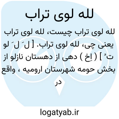لله لوی تراب. [ ل َ ل َ لو ت ُ ] ( اِخ ) دهی از دهستان نازلو از بخش حومه شهرستان ارومیه، واقع در 23هزارگزی شمال خاوری ارومیه و ده هزارگزی خاور شوسه ارومیه به سلماس. جلگه، معتدل و سالم و دارای 160 تن سکنه. آب آن از نازلوچای. محصول آنجا غلات، حبوبات، توتون و کشمش. شغل اهالی زراعت و صنایع دستی جوراب بافی و راه آن ارابه رو است و تابستان اتومبیل توان برد. ( از فرهنگ جغرافیایی ایران ج 4 ).