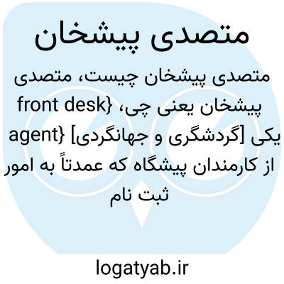 {front desk agent} [گردشگری و جهانگردی] یکی از کارمندان پیشگاه که عمدتاً به امور ثبت نام می پردازد، اما مسئولیت های دیگر او شامل کارهای پیش ثبت نام و هماهنگی وضعیت اتاق ها و امور پستی و رسیدگی به پیام ها و ارائۀ اطلاعات می شود
