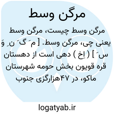 مرگن وسط. [ م َ گ َ ن ِ وَ س َ ] ( اِخ ) دهی است از دهستان قره قویون بخش حومه شهرستان ماکو، در 47هزارگزی جنوب شرقی ماکو در مسیر راه خوی به ماکو و در جلگه معتدل واقع و دارای 108 تن سکنه است. آبش از قنات و چشمه و محصولش غلات و حبوبات و شغل مردمش زراعت و گله داری، و صنایع دستی آن جاجیم بافی است. ( از فرهنگ جغرافیایی ایران ج 4 ).