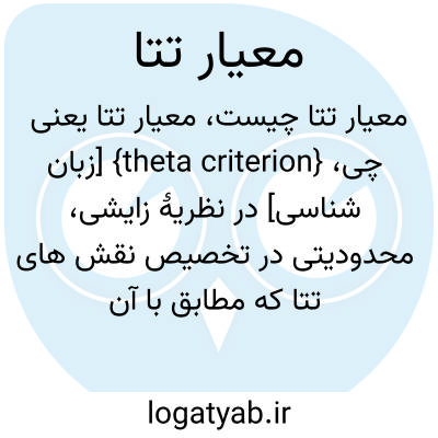 {theta criterion} [زبان شناسی] در نظریۀ زایشی، محدودیتی در تخصیص نقش های تتا که مطابق با آن هر موضوع فقط یک نقش تتا می پذیرد و هر نقش تتا فقط به یک موضوع تخصیص داده می شود