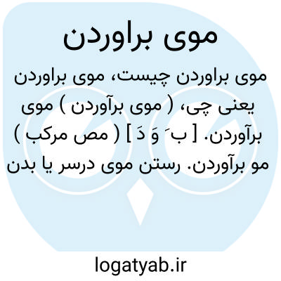 ( موی برآوردن ) موی برآوردن. [ ب َ وَ دَ ] ( مص مرکب ) مو برآوردن. رستن موی درسر یا بدن انسان یا حیوان عموماً و بچه ها و نوزاد آنها خصوصاً. ( از یادداشت مؤلف ): استشعار؛ موی برآوردن بچه در شکم مادر. اِشعار، تشعر، تشعیر؛ موی برآوردن بچه در شکم. ( منتهی الارب ). || بیرون کشیدن موی از چیزی. || کنایه از دقت کردن.
