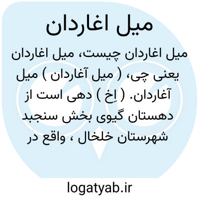 ( میل آغاردان ) میل آغاردان. ( اِخ ) دهی است از دهستان گیوی بخش سنجبد شهرستان خلخال، واقع در 15هزارگزی شمال گیوی با 334 تن سکنه. آب آن از چشمه و راه آن مالرو است. ( از فرهنگ جغرافیائی ایران ج 4 ).