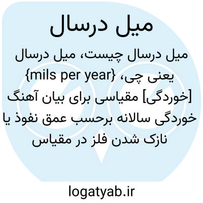 {mils per year} [خوردگی] مقیاسی برای بیان آهنگ خوردگی سالانه برحسب عمق نفوذ یا نازک شدن فلز در مقیاس هزارم اینچ که با محاسبۀ میزان کاهش وزن نمونۀ فلزی در حین آزمون خوردگی تعیین می شود