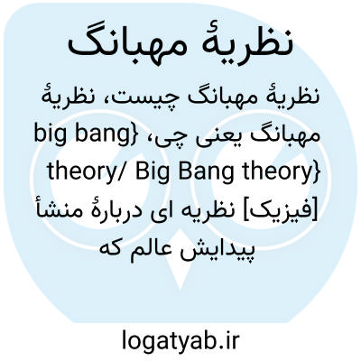 {big bang theory/ Big Bang theory} [فیزیک] نظریه ای دربارۀ منشأ پیدایش عالم که براساس آن عالم از انفجار یک تودۀ بسیار متراکم نقطه ای شکل پدید آمده است