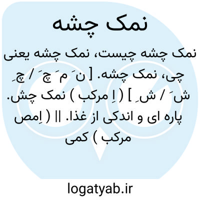 نمک چشه. [ ن َ م َ چ َ / چ ِ ش َ / ش ِ ] ( اِ مرکب ) نمک چش. پاره ای و اندکی از غذا. || ( اِمص مرکب ) کمی چشیدن. کمی خوردن از چیزی. ( یادداشت مؤلف ).