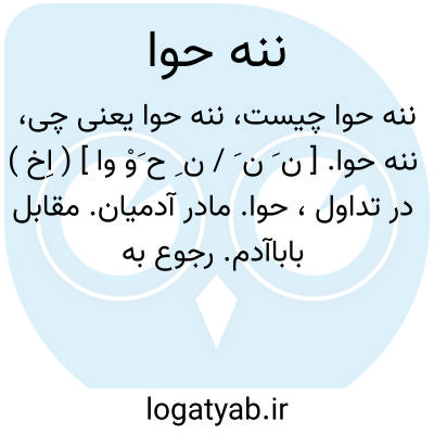 ننه حوا. [ ن َ ن َ / ن ِ ح َوْ وا ] ( اِخ ) در تداول، حوا. مادر آدمیان. مقابل باباآدم. رجوع به حوا شود. || ( اِ مرکب ) در گیاه شناسی، نام گیاهی است از تیره چتریان که یکساله است و برگهائی شبیه برگ زردک دارد و ارتفاعش بین 30 تا 90 سانتی متر است و به طور خودرو در آسیای صغیر و هندوستان و مصر و ایران و مناطق بحرالرومی می روید. میوه اش بیضی شکل و شبیه میوه جعفری است ومورد استعمال داروئی دارد و گلهایش سفیدرنگند. از میوه این گیاه عطری با بوئی مطبوع به دست می آورند که شامل مخلوطی است از تیمول و سیمن. این میوه بادشکن و ضدتهوع است و بعلاوه دارای اثر قابض و محرک قوه باه است و خاصیت ضدکرم و مدر دارد. نامهای دیگر آن نانخواه، نخوه، انیسون بری، اجواین، اجواین مصری، اجواین هندی، آموس، زنیان، کمون ملوکی، امیوس، اناصون مصری، انیسون مصری، نشوان هندی، انبوس، اجامدون، وومون، کمون السودان، نانوخه، نانخه، برامداریها، امی است. ( فرهنگ فارسی معین ). و نیز رجوع به نانخواه شود.