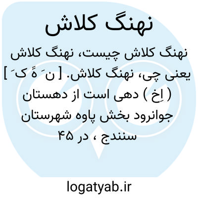 نهنگ کلاش. [ ن َ هََ ک َ ] ( اِخ ) دهی است از دهستان جوانرود بخش پاوه شهرستان سنندج، در 45 هزارگزی جنوب غربی پاوه، در فاصله دهات نهنگ باباجانی و هوش، در منطقه کوهستانی معتدل هوایی واقع است و 128 تن سکنه دارد. آبش از چشمه، محصولش لبنیات و انواع محصولات جنگلی از قبیل سقز و بلوط و مازو و کتیرا و شغل مردمش زراعت و جمعآوری محصولات جنگلی است. ( از فرهنگ جغرافیائی ایران ج 5 ).