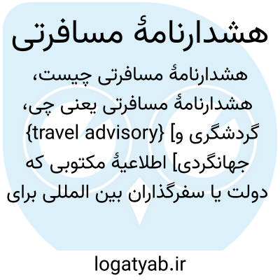 {travel advisory} [گردشگری و جهانگردی] اطلاعیۀ مکتوبی که دولت یا سفرگذاران بین المللی برای آگاه کردن مسافران از خطرات و مشکلات احتمالی در مناطق یا کشورهای خاص صادر می کنند
