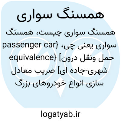 {passenger car equivalence} [حمل ونقل درون شهری-جاده ای] ضریب معادل سازی انواع خودروهای بزرگ نظیر اتوبوس با خودروهای سواری؛ محاسبۀ این ضریب به اندازه و وزن و سرعت خودروها و همچنین خصوصیات جاده، نظیر شیب آن، بستگی دارد