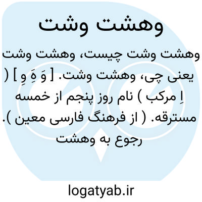 وهشت وشت. [ وَ هَِ وِ ] ( اِ مرکب ) نام روز پنجم از خمسه مسترقه. ( از فرهنگ فارسی معین ). رجوع به وهشت شود.