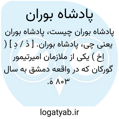 پادشاه بوران. [ دْ / دِ ] ( اِخ ) یکی از ملازمان امیرتیمور گورکان که در واقعه دمشق به سال 803 هَ. ق. از جانب وی برسالت نزد ملک فرخ مدافع آن شهر رفت. ( حبیب السیر ج 2 ص 160 ).