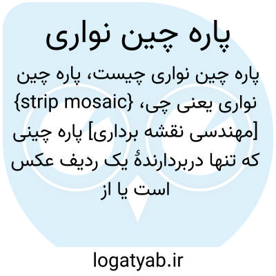 {strip mosaic} [مهندسی نقشه برداری] پاره چینی که تنها دربردارندۀ یک ردیف عکس است یا از کنار هم گذاشتن نوارهای پاره چین تولید شود