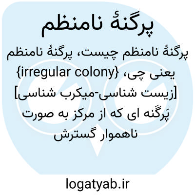 {irregular colony} [زیست شناسی-میکرب شناسی] پَرگَنه ای که از مرکز به صورت ناهموار گسترش یافته و لبه های نامنظم دارد