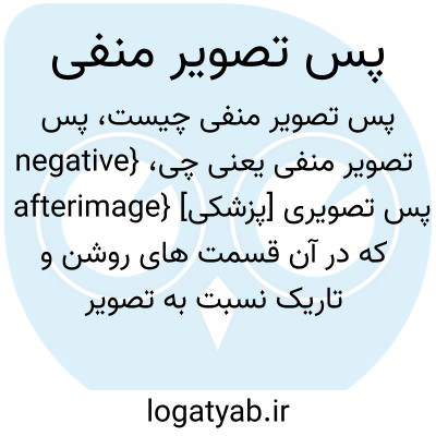 {negative afterimage} [پزشکی] پس تصویری که در آن قسمت های روشن و تاریک نسبت به تصویر اصلی معکوس و مکمل یکدیگرند