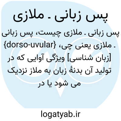 {dorso-uvular} [زبان شناسی] ویژگی آوایی که در تولید آن بدنۀ زبان به ملاز نزدیک می شود یا در تماس با آن قرار می گیرد