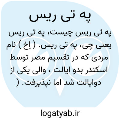 لغت نامه دهخدا په تی ریس. ( اِخ ) نام مردی که در تقسیم مصر توسط اسکندر بدو ایالت، والی یکی از دوایالت شد اما نپذیرفت. ( ایران باستان ج 2 ص 1358 ).