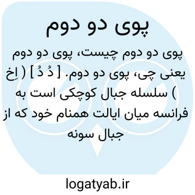 پوی دو دوم. [ دُ دُ ] ( اِخ ) سلسله جبال کوچکی است به فرانسه میان ایالت همنام خود که از جبال سونه معدود و از طرف جنوب با مونت دوره مربوط است.45 هزارگز درازا دارد و بلندترین قله آن دارای 1465 گز ارتفاع است. پاسکال عالم طبیعی معروف تجارب اولیه بارومتری خود را بالای این کوه انجام داده است.، پوی دودوم. [ دُ دُ ] ( اِخ ) از ایالات وسطای فرانسه. مرکب از اورنی و بوربونه و فرز، متشکل از 4 استان و پنجاه کانتون و 473 کمون و 486105 تن سکنه.