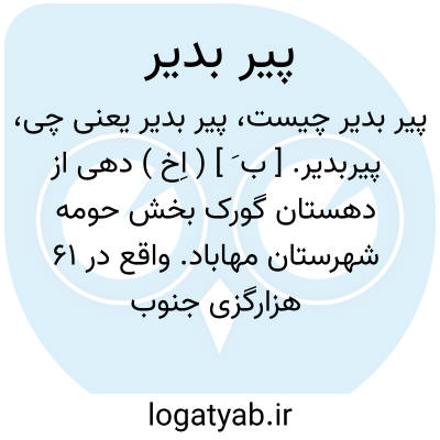پیربدیر. [ ب َ ] ( اِخ ) دهی از دهستان گورک بخش حومه شهرستان مهاباد. واقع در 61 هزارگزی جنوب خاوری مهاباد و 22 هزارگزی خاور شوسه مهاباد بسردشت. کوهستانی، سردسیر، سالم. دارای 35 تن سکنه. آب آن از رودخورخوره، محصول آنجا غلات و توتون و حبوبات.شغل اهالی زراعت و گله داری، صنایع دستی جاجیم بافی، و راه آن مالرو است. ( فرهنگ جغرافیایی ایران ج 4 ).