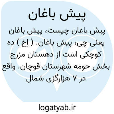 پیش باغان. ( اِخ ) ده کوچکی است از دهستان مزرج بخش حومه شهرستان قوچان. واقع در 7 هزارگزی شمال خاوری قوچان. کوهستانی. معتدل. دارای 17 تن سکنه. ( فرهنگ جغرافیائی ایران ج 9 ).