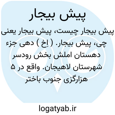 پیش بیجار. ( اِخ ) دهی جزء دهستان املش بخش رودسر شهرستان لاهیجان. واقع در 5 هزارگزی جنوب باختر رودسر و 6 هزارگزی خاور املش. جلگه، معتدل، مرطوب، دارای 200 تن سکنه. آب از نهر پل رود، محصول آن برنج و چای. شغل اهالی آن زراعت و حصیربافی است و راه آنجا مالرو میباشد. ( فرهنگ جغرافیایی ایران ج 2 ).