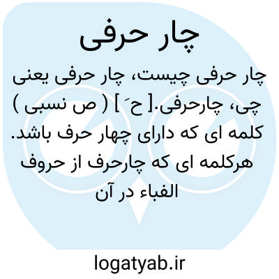 چارحرفی.[ ح َ ] ( ص نسبی ) کلمه ای که دارای چهار حرف باشد. هرکلمه ای که چارحرف از حروف الفباء در آن باشد. کلمه ٔچارحرفی از قبیل: مادر، بابا، جهان، زانو و غیره.