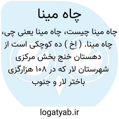 چاه مینا. ( اِخ ) ده کوچکی است از دهستان خنج بخش مرکزی شهرستان لار که در 108 هزارگزی باختر لار و جنوب فلات دنک واقع شده و 16 تن سکنه دارد. ( از فرهنگ جغرافیایی ایران ج 7 ).