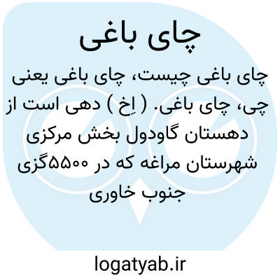 چای باغی. ( اِخ ) دهی است از دهستان گاودول بخش مرکزی شهرستان مراغه که در 5500گزی جنوب خاوری مراغه و 3هزارگزی خاور شوسه مراغه به میاندوآب واقع شده است، دره معتدل و مالاریائی است و 387 تن سکنه دارد آبش از رودخانه مروی، محصولش غلات، کشمش، بادام و زردآلو، شغل اهالی زراعت، صنایع دستی جاجیم بافی وراهش مالرو است. ( از فرهنگ جغرافیایی ایران ج 4 ).