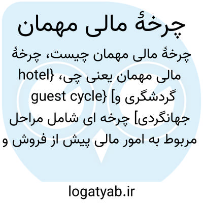 {hotel guest cycle} [گردشگری و جهانگردی] چرخه ای شامل مراحل مربوط به امور مالی پیش از فروش و در محل فروش و پس از فروش که تبادلات مالی میان مهمان و مراکز گوناگون مربوط به اجاره یا کرایه را نشان می دهد