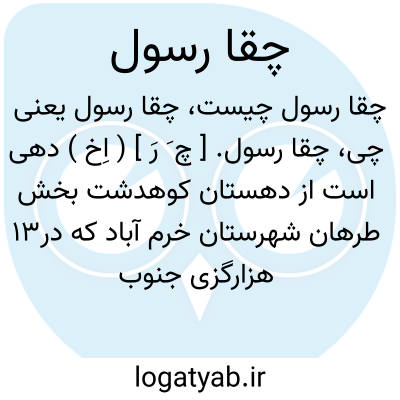 چقا رسول. [ چ َ رَ ] ( اِخ ) دهی است از دهستان کوهدشت بخش طرهان شهرستان خرم آباد که در13 هزارگزی جنوب خاوری کوهدشت و 7 هزارگزی جنوب راه شوسه خرم آباد به کوه دشت واقع است. تپه ماهوری و معتدل است و 120 تن سکنه دارد. آبش از چاه، محصولش غلات، لبنیات و پشم، شغل اهالی زراعت و گله داری، صنایع دستی زنان بافتن سیاه چادر و طناب و راهش اتومبیل رو است. ( از فرهنگ جغرافیائی ایران ج 6 ).