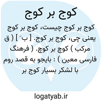 کوج بر کوج. [ ب َ ] ( ق مرکب ) کوچ بر کوچ. ( فرهنگ فارسی معین ): بایجو به قصد روم با لشکر بسیار کوج بر کوج از ارزن الروم تا آقسرا آمد. ( مسامرة الاخبار ص 40 از فرهنگ فارسی معین ). رجوع به کوچ بر کوچ شود.
