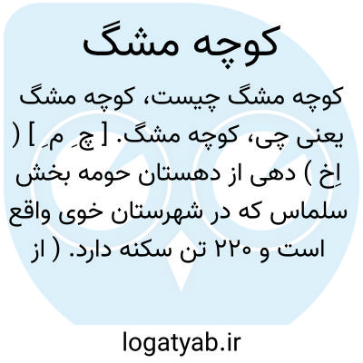 کوچه مشگ. [ چ ِ م ِ ] ( اِخ ) دهی از دهستان حومه بخش سلماس که در شهرستان خوی واقع است و 220 تن سکنه دارد. ( از فرهنگ جغرافیایی ایران ج 4 ).