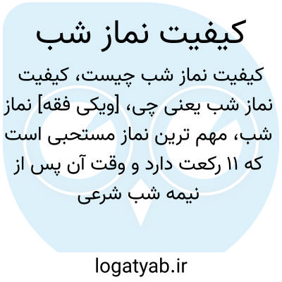 [ویکی فقه] نماز شب، مهم ترین نماز مستحبی است که ۱۱ رکعت دارد و وقت آن پس از نیمه شب شرعی تا طلوع فجر است. چهار نماز دو رکعتی (مانند نماز صبح) به نیت نماز شب و یک دو رکعت به نیت نماز شَفْعْ و یک یک رکعتی به نیت نماز وَتْر.