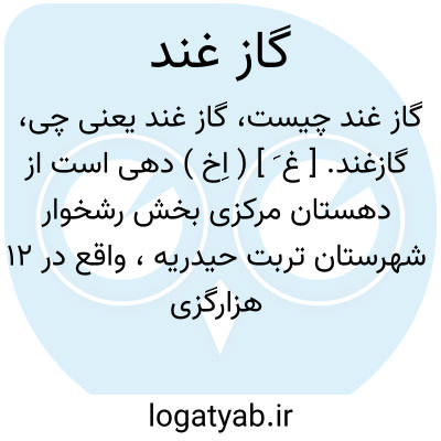 گازغند. [ غ َ ] ( اِخ ) دهی است از دهستان مرکزی بخش رشخوار شهرستان تربت حیدریه، واقع در 12 هزارگزی شمال رشخوار، دامنه، معتدل. دارای 3 تن سکنه.آب آن از قنات، محصول آنجا غلات، شغل اهالی زراعت، راه آن مالرو است. ( از فرهنگ جغرافیایی ایران ج 9 ).