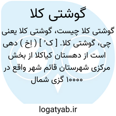 گوشتی کلا. [ ک ُ ] ( اِخ ) دهی است از دهستان کیاکلا از بخش مرکزی شهرستان قائم شهر واقع در 10000 گزی شمال باختری قائم شهر و 2500 گزی خاور شوسه قائم شهر به بابل. دشت و معتدل مرطوب و مالاریایی است. سکنه آن 150 تن است. آب آن از رودخانه تالار و چاه تأمین میشود. محصول آن برنج و کنجد و کنف و پنبه و شغل اهالی زراعت و راه آن مالرو است. ( از فرهنگ جغرافیایی ایران ج 3 ).