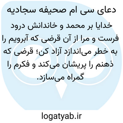 خدایا بر محمد و خاندانش درود فرست و مرا از آن قرضی که آبرویم را به خطر میاندازد آزاد کن؛ قرضی که ذهنم را پریشان میکند و فکرم را گمراه میسازد، و مدت زیادی مرا با خود مشغول میکند. ای پروردگار، از غم قرض و اندیشهٔ آن، و از گرفتاریِ بدهی و بیخوابیاش به تو پناه میبرم. پس بر محمد و اهل بیتش درود فرست، و مرا از آثار آن محافظت کن؛ و از ذلت قرض در زندگی و دنبالهاش پس از مرگ، به تو پناه میبرم.
