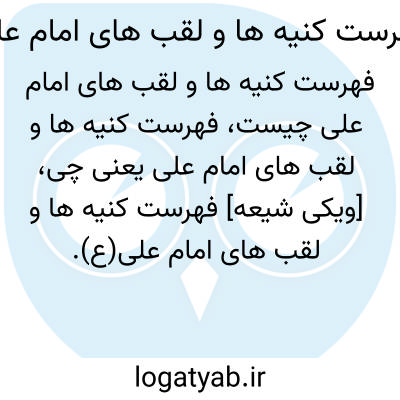 [ویکی شیعه] فهرست کنیه ها و لقب های امام علی(ع). فهرست کنیه ها و لقب های امام علی(ع) مجموعه لقب ها و کنیه های علی(ع) امام اول شیعیان است که در منابع متعدد شیعه و اهل سنت آمده است. علی اصغر شکوهی در اسماء و القاب امیرالمومنین، بیش از ۳۰۰، علامه هادی بن ابراهیم در البروج فی اسماء امیرالمومنین تا ۲۹۰ و ثابتی در القاب و صفات مولای متقیان، بیش از ۵۹۰ عنوان اسم، لقب و صفت را برای امام شمرده اند. بنا بر آنچه در منابع متقدم و متأخر درباره القاب و کنیه های امام علی(ع) آمده، فهرست آن ها به این شرح است: