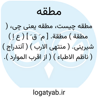 ( مطقة ) مطقة. [ م َ ق َ ] ( ع اِ ) شیرینی. ( منتهی الارب ) ( آنندراج ) ( ناظم الاطباء ) ( از اقرب الموارد ).