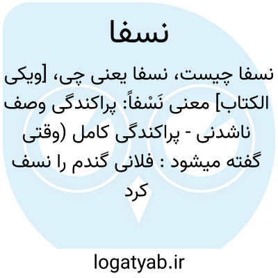 [ویکی الکتاب] معنی نَسْفاً: پراکندگی وصف ناشدنی - پراکندگی کامل (وقتی گفته میشود: فلانی گندم را نسف کرد، معنایش این است که آن را با منسف بالا انداخت تا پوستهایش بپرد )