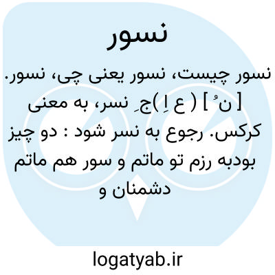 هم ماتم دشمنان و هم سور نسور.یزدانی.این شهر سوری داشت که نسور بر موازاة شرفات او نرسیدندی. ( ترجمه تاریخ یمینی ص 257 ). از آن طایفه سباع را اشباعی تمام و نسور را سوری به نوا حاصل شد. ( ترجمه تاریخ یمینی ص 191 ). سباع بی نزاع با ذئاب درساختند و نسور بی نشور با عقاب همخوان گشتند. ( جهانگشای جوینی ).