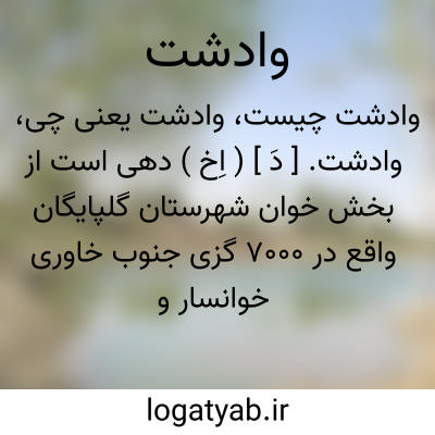 وادشت. [ دَ ] ( اِخ ) دهی است از بخش خوان شهرستان گلپایگان واقع در 7000 گزی جنوب خاوری خوانسار و 6000 گزی خاور راه شوسه خوانسار به اصفهان نقطه ای است کوهستانی، سردسیر که 626 تن سکنه دارد، با آب قنات مشروب میشود و محصول آن غلات، تنباکو و لبنیات و شغل ساکنان آن زراعت و گله داری است. راه آن مالرو و دارای دبستان است. ( از فرهنگ جغرافیائی ایران ج 6 ).